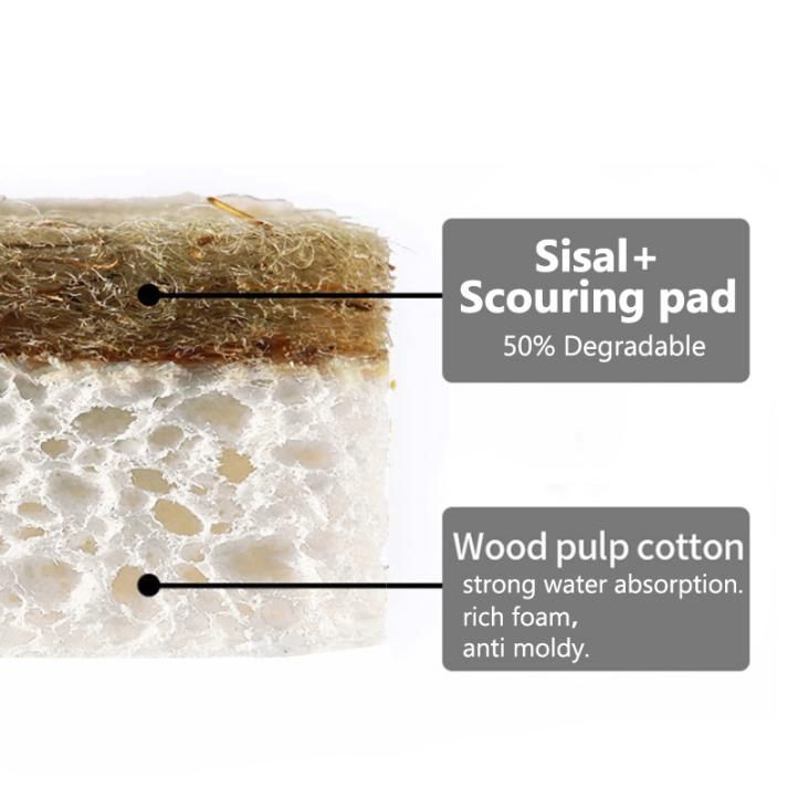 냄새가 없는 친환경 주방스펀지를 소개합니다. 폴리에스터 스펀지나 합성천처럼 악취와 박테리아가 쌓이지 않습니다. 사이잘 섬유의 견고함과 마모성으로 인해 식물성 스폰지의 정련 부분에 사용됩니다. 이 주방 스펀지는 목재 펄프 셀룰로오스(흰색 부분)와 천연 사이잘 섬유 50%, 폴리우레탄(노란색 부분) 50%로 만들어져 있어 수세미로 잘 닦입니다.