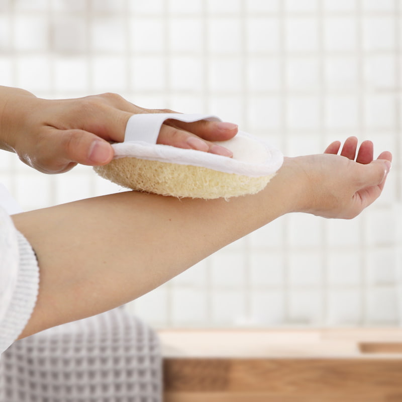 / 제품 / 목욕 스펀지 / 목욕 수세미 / 각질 제거와 부드러운 클렌징을 위한 목욕 도구 수세미 스펀지, 양면 스크러버