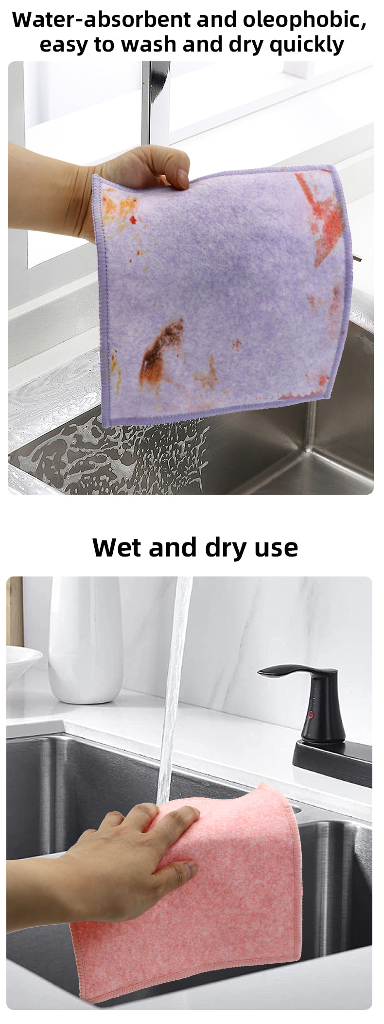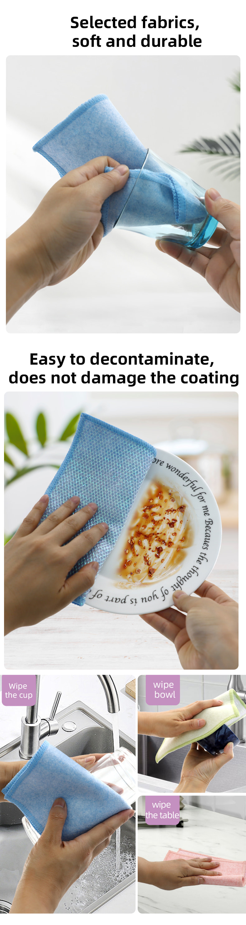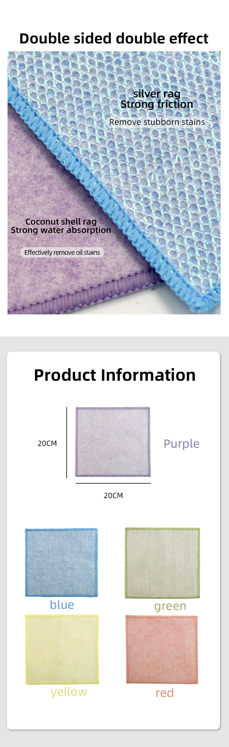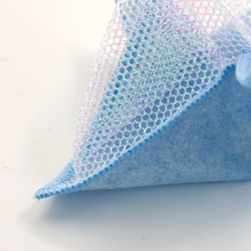 특별한 모양의 구조, 다채롭고 높은 외관; 한쪽은 긁는 능력이 강한 다채로운 청소용 천이고 다른 쪽은 긁는 동안 청소의 이중 기능을 충족하는 메쉬 천입니다. 오일프리이며 흡수력이 강합니다. 한쪽에는 다양한 패턴의 컬러풀한 실크가 이식되고, 다른 한쪽에는 기름지지 않고 물을 흡수하는 비스코스 천 표면이 아름다우며 한쪽에는 스크러빙과 스크러빙의 이중 기능을 충족시킬 수 있습니다.